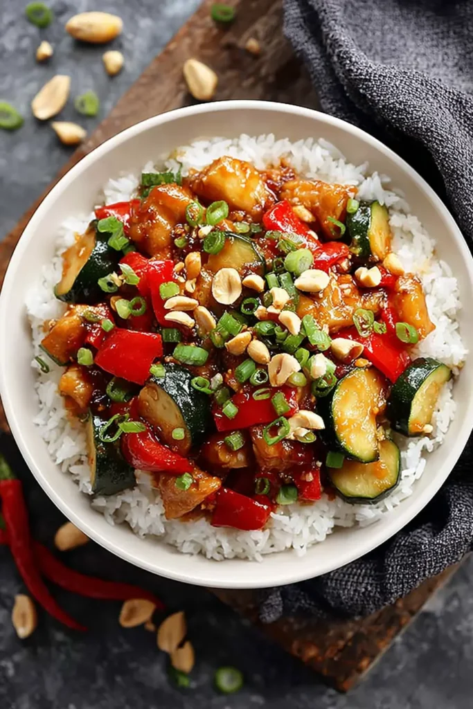 Serve the Kung Pao Chicken over cooked rice or quinoa, garnished with chopped green onions and sesame seeds if desired. Enjoy your delicious meal!