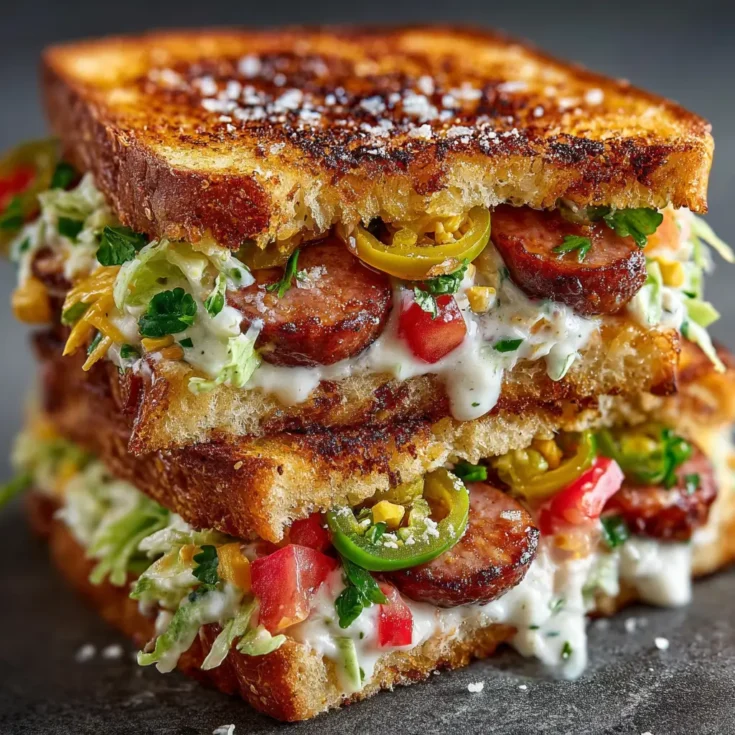- Assemble Sandwich: Spread mayonnaise on one side of each slice. Layer sausage, lettuce, tomatoes, and jalapeños. Drizzle with mustard, season, and top with another slice of bread.